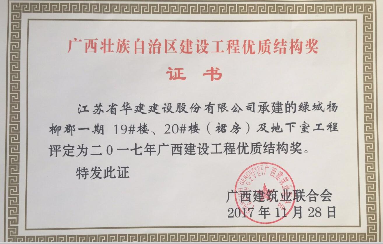 近期從廣西建筑業聯合會獲悉,我公司總承包施工的廣西自治區柳州市“綠城楊柳郡一期19#、20#樓(裙房)及地下室工程”和“綠城楊柳郡一期15#樓及地下室工程”兩項工程被評定為二0一七年廣西建設工程優質結構獎,這也是北京區域公司在廣西自治區獲獎的第一個項目。