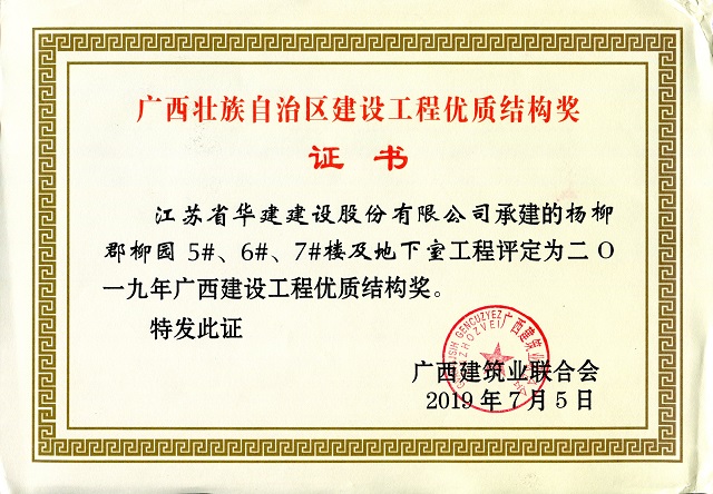 另外,由我司承建的楊柳郡柳園5#、6#、7#樓及地下室工程被評定為2019年廣西建設工程優質結構獎。