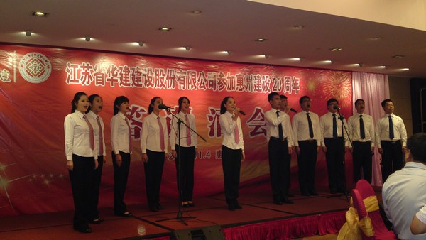 在演出中,由惠州公司員工莊曙演繹的男聲獨唱《把一切獻給黨》,以高亮的美聲唱法,讓在座嘉賓擊掌叫好;渾厚深沉的歌聲,給在場觀眾無盡遐想;一句“千萬年守候,永不回頭”,更是唱出了華建人對事業的忠誠與信念,對未來的堅定與信仰。此后,由惠州公司12名男女員工組成小合唱團演唱的《華建之歌》,則用熟悉而又清麗的形式抒寫了一曲華建頌歌。激情昂揚的旋律、朗朗上口的歌詞,展示了三十年來公司取得的非凡成績;形式新穎的合唱風格、清新不俗的表演方式,掀起了整場酒會演出的高潮;臺上的小合唱變成了在場華建人的大合唱,掌聲歡呼聲此起彼伏,酒會取得了圓滿成功。