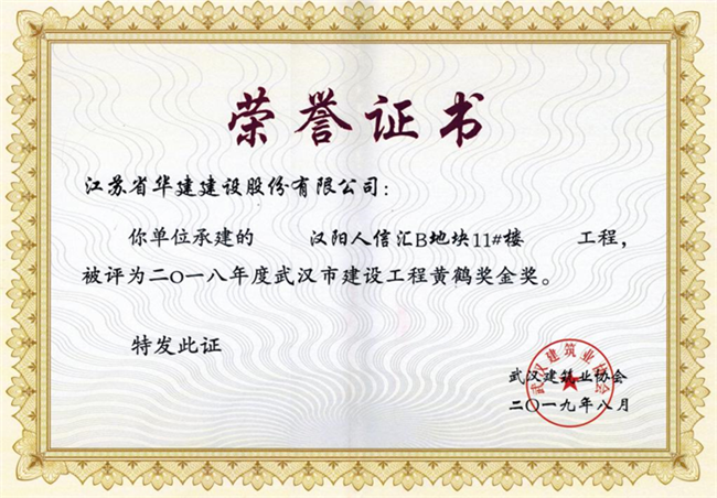 湖北漢陽人信匯B地塊11#樓工程榮獲武漢市黃鶴獎金獎