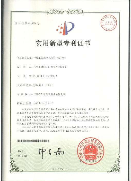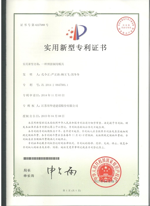 三項(xiàng)實(shí)用新型成果分別是:1、《一種預(yù)留洞用模具》(專(zhuān)利號(hào):ZL201420647560.1,專(zhuān)利權(quán)人:孔令正、嚴(yán)正濤、楊玉飛、郭冬冬);2、《一種型鋼混凝土的模板支撐結(jié)構(gòu)》(專(zhuān)利號(hào):ZL201420647633.7,專(zhuān)利權(quán)人:孔令正、楊玉飛、曹亞明、郭冬冬);3、《一種塔式起重機(jī)附著伸縮撐桿》(專(zhuān)利號(hào):ZL201420647600.2,專(zhuān)利權(quán)人:孔令正、楊玉飛、曹亞明、湯文平)。
