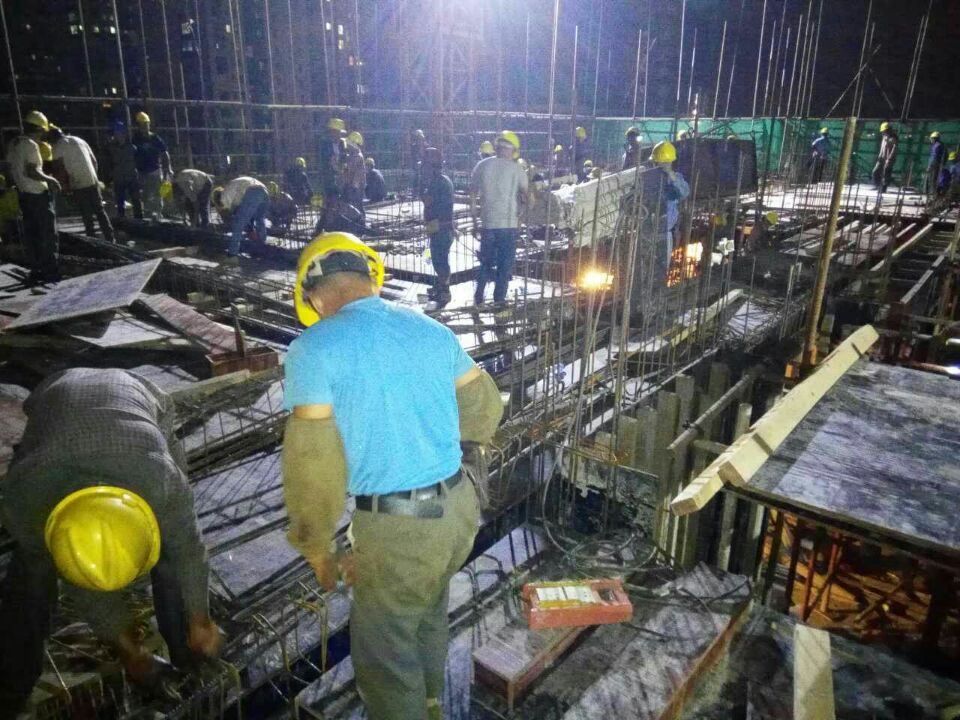 客戶的要求就是使命。江蘇華建上海公司本著“客戶至上”的原則,立即成立臨時指揮部,上海公司蘇南分公司、第八工程處全員出動,在短短的一個小時內(nèi)完成了施工方案制訂、班組人員協(xié)調(diào)和設(shè)備材料到位等全部準(zhǔn)備工作。配置鋼筋工46人、木工78人、瓦工18人、水電工23人。30日上午9點(diǎn),開始墻柱鋼筋綁扎作業(yè),并在3個小時內(nèi)完成任務(wù),期間同時穿插木工搭設(shè)排架、安裝墻板等施工作業(yè)。下午2點(diǎn),模板頂板鋪設(shè)基本完成,水電工2小時內(nèi)完成水電預(yù)埋。下午6點(diǎn),木工用時2小時完成吊模作業(yè);實測實量組和項目部所有質(zhì)檢員全程跟蹤檢查驗收,嚴(yán)把工程質(zhì)量關(guān)。夜間10點(diǎn),完成問題整改使之具備砼澆筑條件。31日凌晨4點(diǎn),七層主體工程砼澆筑工作全部完成,也由此創(chuàng)造出江蘇華建上海公司“24小時澆筑一層樓”的施工新速度。