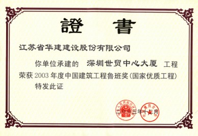 招商銀行大廈工程1998年6月18日開工,2001年9月29日竣工,觀感得分91.9分,評定為“優(yōu)良工程”;先后榮獲深圳市優(yōu)質樣板工程“金牛獎”、江蘇省優(yōu)“揚子杯”、廣東省優(yōu)良樣板工程,2003年榮獲“中國建筑工程魯班獎”。