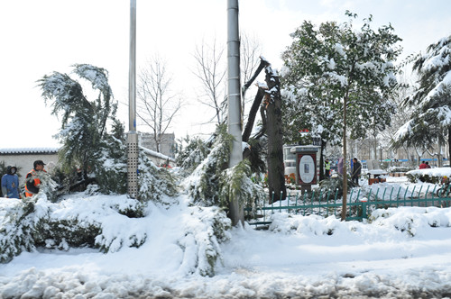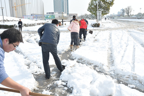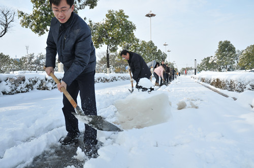 公司總部組織員工上路清掃積雪 時間:2013-02-19 4373 2月18日至19日凌晨,揚州出現低溫降雪災害天氣,降下了多年罕見的一場大雪,壓垮樹枝和部分房屋設施,并造成道路交通不便。19日清晨,公司響應市政府號召,組織20余名員工上路清掃積雪,公司領導吳士茂、錢啟明親自參加,與大家共同會戰2個多小時,完成了清掃任務。 厚重的積雪壓垮樹枝