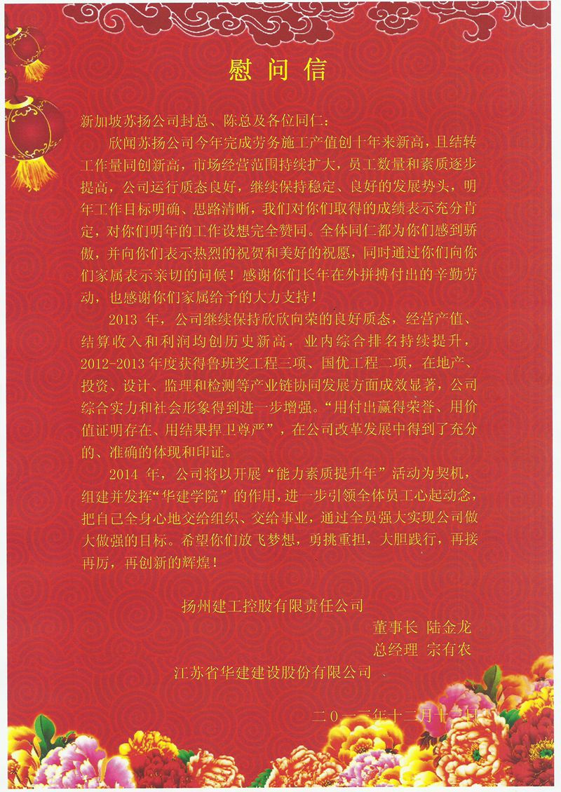 公司董事長、總經理發慰問信鼓勵新加坡蘇揚公司再接再厲 時間:2013-12-13 3786 12月中上旬,公司總部完成了對國內各區域公司的年終走訪調研。新加坡蘇揚公司則通過電子稿匯報了2013年工作情況及下年度工作思路。2013年新加坡蘇揚公司主要經濟指標創歷史新高;隊伍規模保持穩定;班組承包責任制成果顯著;市場份額持續擴大??偛空J為這一年來蘇揚公司保質態,擴市場,穩增長,取得了不俗成績,公司董事長陸金龍、總經理宗有農特發慰問信鼓勵蘇揚公司再接再厲,再創新高!慰問信全文如下: