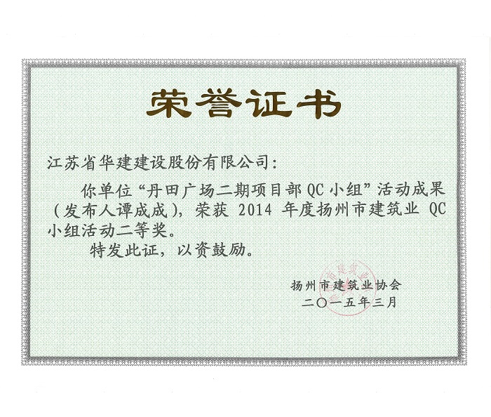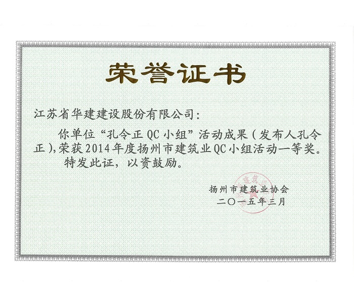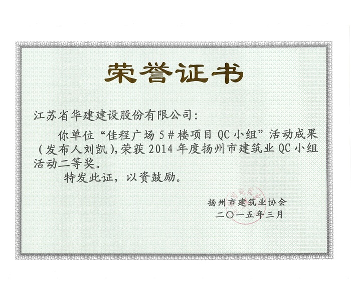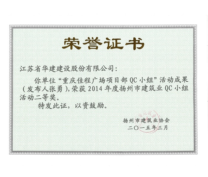 公司5項成果獲揚州市建筑業QC成果獎 時間:2015-03-31 5077 近日,揚州市建筑業協會發文表彰了2015年度全市建筑業QC小組活動成果獎,公司共有5項成果獲獎,其中,“孔令正QC小組”活動成果《剝蝕丘陵地貌多形截面鋼筋混凝土灌注樁施工新方法》榮獲一等獎,“佳程廣場5#樓項目QC小組”活動成果《提高核心筒筒體結構施工質量》、“重慶佳程廣場項目部QC小組”活動成果《提高現澆混凝土樓梯結構施工質量》、“丹田廣場二期項目部QC小組”活動成果《提高蒸壓加氣混凝土砌塊外墻合格率》榮獲二等獎,“馬賽公館項目部QC小組”活動成果《 提高耐磨金剛砂地面施工質量》榮獲三等獎。