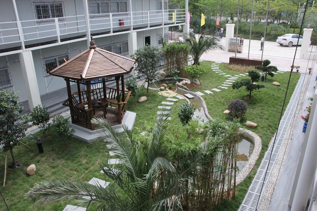 第五項目部負責人陳建表示,在該項目進場之初,就秉承“綠色、環保、節能”的理念,項目部園林景觀的打造全部采用可回收、循環利用的材料。花盆采用廢模板制成,水池循環供水,生活區照明全部采用節能燈,淋浴設施采用空氣能熱水器,空調采用節能產品;并將具有揚州特色的園林景觀融入其中,進行精心布局、合理規劃,將其打造成為工地上的微縮版揚州園林,不僅展示出揚州建筑企業對外的良好形象,更為員工營造一個溫馨舒適的綠色家園。
