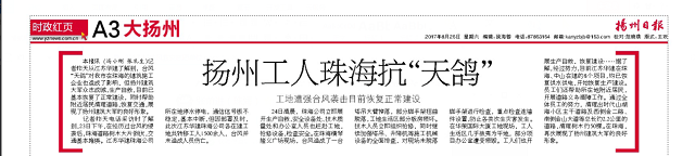 8月23日,珠海遭遇了53年來最強臺風“天鴿”,全市受災嚴重。臺風過后,珠海公司第一時間迅速組織復產(chǎn)自救工作,并主動聯(lián)系珠海有關部門,迅速組織志愿者及重型工程車輛投入到社會道路的清理中去。在這場抗風救災的戰(zhàn)斗中,珠海公司共疏通社區(qū)道路5條、市政道路3 條,清走倒伏大樹200余棵,運送災后垃圾 20車次。《揚州日報》A3版顯著位置對公司抗風救災活動進行了報道,點評江蘇華建珠海公司“眾志成城,生產(chǎn)自救,展現(xiàn)了揚州建筑大軍的良好形象”。